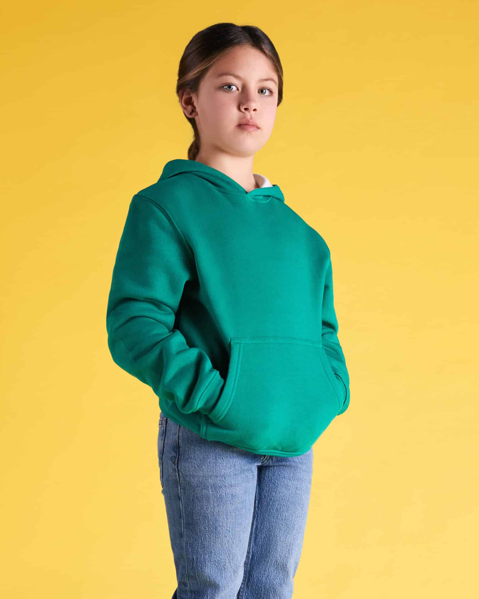 Sweatshirt avec capuche doublée. Poignets et taille côtelés 2×1 avec élasthanne. Coutures bordées de tissu assorti. Cordon de serrage plat sur la capuche. Options de couleur avec capuche contrastée et œillets en métal assortis.