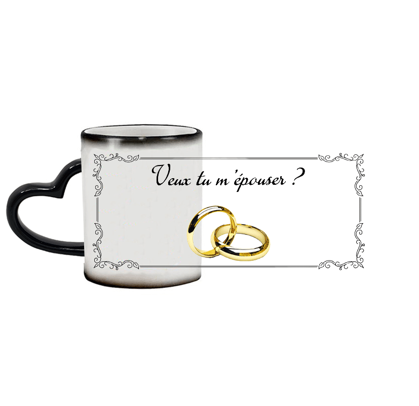 Mug magique noir avec anse en forme de cœur. Sous l’effet de la chaleur, le message apparait lorsque le mug s’éclaircit en affichant également les magnifiques alliances.