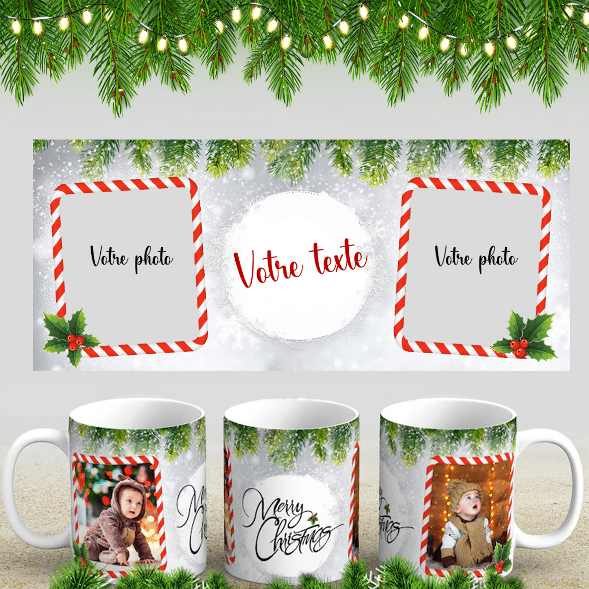 Décor style branche de sapin et neige tombante. Avec le formulaire ci-dessus, complétez le avec deux photos et le texte souhaité comme sur le modèle en image jointe.
