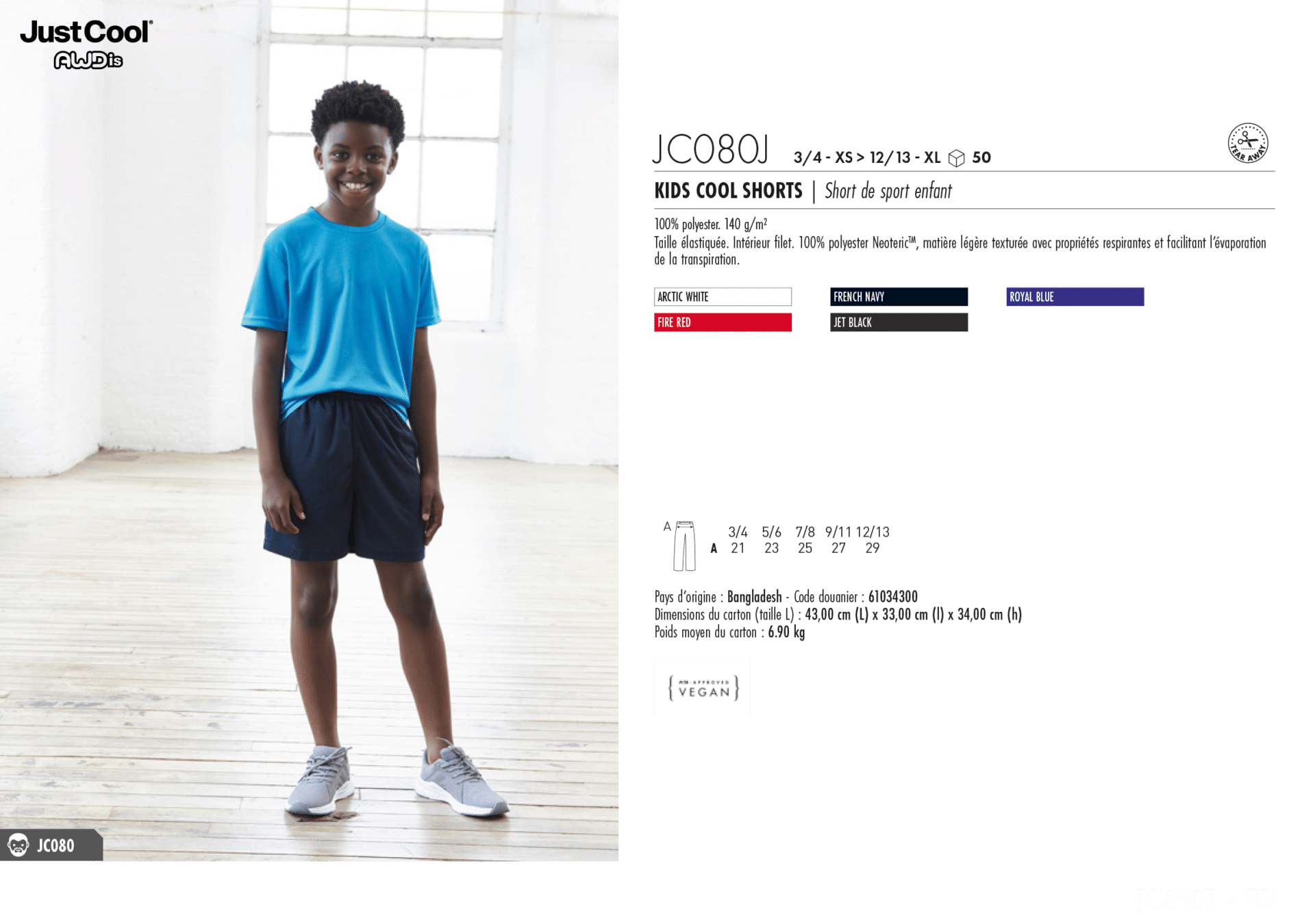 Short de sport enfant – Taille élastiquée. Intérieur filet. 100% polyester Neoteric™, matière légère texturée avec propriétés respirantes et facilitant l’évaporation de la transpiration.