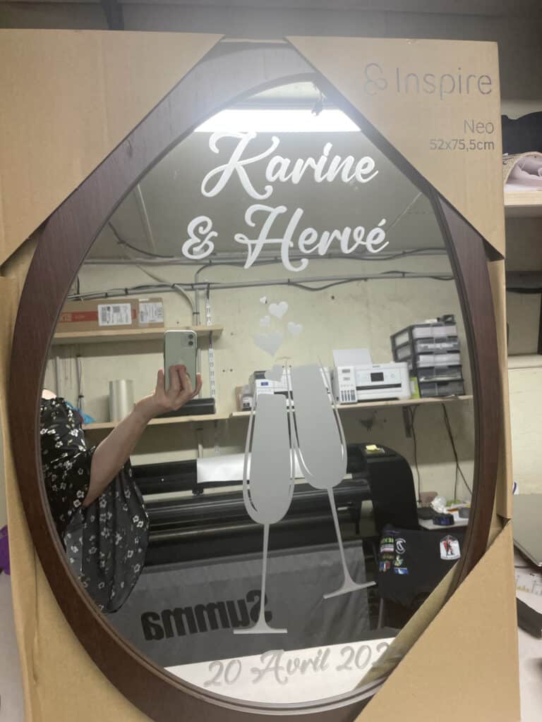 Personnalisation réalisée en découpe d’adhésif dépoli posé sur un miroir. cadeau de mariage